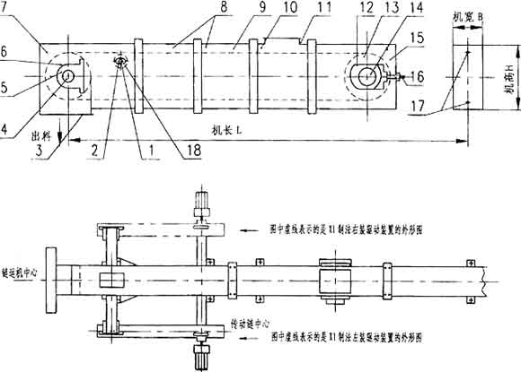 9、輸送鏈 10、中間節(jié)(非標) 11、進料口 12、尾軸承箱 13、尾輪 14、尾軸 15、尾部